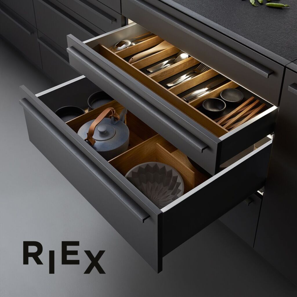 Das Möbelgriffprogramm RiexTouch bietet fünf Produktlinien – von natürlichen Griffen aus Holz über solche aus Chrom, Edelstahl und Nickel bis hin zu Griffen im Landhausstil. Ergänzend gibt es Knöpfe, Griffleisten und Haken für Möbelschränke und Garderoben. Auch für Küchen bietet Riex ein umfangreiches Programm: Hoch- und Unterschränke, Eckschränke und weiteres Zubehör. Von Besteckeinsätzen, Anti-Rutsch-Matten über Lüftungsgitter bis hin zu Barkonsolen sind alle Ausstattungselemente verfügbar.