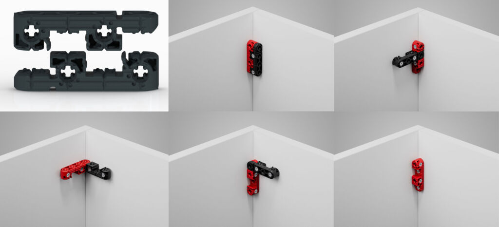 Dank dieser kompakten Baumaße ist der Einsatz an der Stirnseite möglich. Befestigt werden kann er im 32mm Raster, die Stärke dieser Rastfunktion kann über die Anzahl der eingesetzten Verbinder variiert werden. Durch die Einrastpunkte kann der Beschlag in Winkeln von 90 bis 270° fixiert werden. Die Clipverbindung macht den Beschlag auch wieder lösbar – hilfreich, wenn z.B. das Möbel wieder ab- oder umgebaut werden muss.