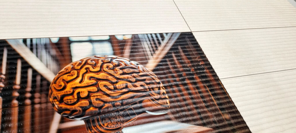 Einen Blickfang der besonderen Art hatte Atmos Vakuumpressen auf der Holz-Handwerk 2024 im Gepäck: Keramikfliesen mit einer tiefen, fast gefräst wirkenden Oberflächenstruktur mit Hirnholz-Optik. Das Besondere an diesen Fliesen: Durch das von Atmos entwickelte Verfahren der 3D-Sublimation konnte das Design in höchster Qualität direkt in die Oberfläche der Fliesen übertragen werden.