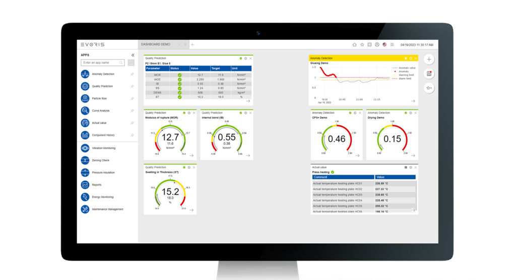 Eine wichtige Rolle wird Künstliche Intelligenz deshalb auch in der Holzwerkstoffproduktion spielen. Potenziale sind schon heute augenfällig. Denn durch die Nutzung smarter Tools gewinnt die Produktionsanlage an Intelligenz und unterstützt Anlagenbetreiber und -bediener dabei, Transparenz in ihre Produktionsprozesse zu bringen. Auf der Grundlage von Daten, die ohne Künstliche Intelligenz nicht gewonnen werden könnten, erhalten Bediener tiefere Einblicke in ihre Anlagenprozesse, als bisher denkbar war. Das ermöglichen Digitalisierungslösungen mit ihren smarten Algorithmen, wie sie die Softwareplattform Evoris von Dieffenbacher integriert: eine ständige Überwachung der Produktionsschritte sowie Vorhersagen und Optimierungen der Prozesse in der Holzwerkstofffertigung. Mithilfe umfassender Analysen von Live-Daten verstehen Anlagenbetreiber ihre Anlagen besser und treffen wichtige Entscheidungen schneller und fundierter. Eine gesteigerte Anlagenverfügbarkeit, eine sichere Plattenqualität, die Vermeidung von Ausschuss sowie Einsparungen von wertvollen und teuren Rohstoffen wie Holz, Leim oder Energie sind die Folge.