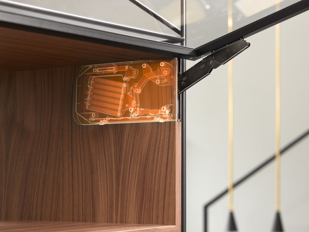 Die Technik von Aventos HKi ist in der Seitenwand des Möbels versteckt und dennoch jederzeit spürbar: Dank der Dämpfung Blumotion schließt die Klappe immer sanft und leise. Verarbeiter müssen trotz der Integration im Korpus nicht auf die dreidimensionale Einstellungen von vorne, den integrierten Öffnungswinkelbegrenzer oder den stufenlosen Stopp verzichten. Einmal eingestellt, hält die Front in jeder Position und ist dadurch wieder leicht zu schließen. Unterschiedliche, symmetrisch verwendbare Kraftspeichertypen schaffen Flexibilität für Lösungen mit bis zu 18kg schweren Fronten. Um grifflose Anwendungen auszuführen, ist der integrierte Klappenbeschlag auch mit der Bewegungstechnologie Tip-On kombinierbar. All das bei einer schmalen Bauweise von nur wenigen Millimetern.