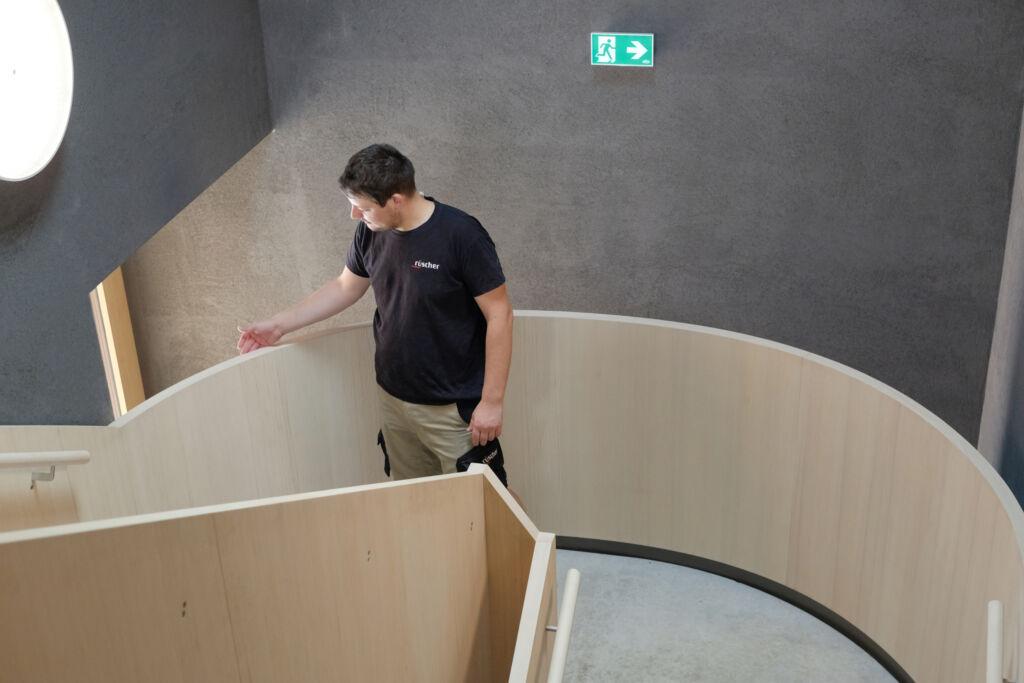 Für die meisten Aufträge sei die Werkstatt bereits gut ausgestattet gewesen, blickt Rüscher-Produktionsleiter David Grohe zurück. So nutzte sie für Formteile teilweise einen Vakuumsack. Der stieß jedoch gelegentlich an seine Grenzen. Mit der neugebauten Halle kam dann Platz für eine Ergänzung des Maschinenparks, und Grohe konnte seinen Geschäftsführer Christian Rüscher von der Anschaffung überzeugen. „Die flexible Kombination aus Loch- und ausklappbarer Vakuumpresse entsprach genau unseren Wünschen“, zählt er als einen Grund auf. Seit Inbetriebnahme entdeckt der Tischlermeister nun regelmäßig weitere Einsatzmöglichkeiten des Neuzugangs – etwa beim Treppenprojekt. „Hier konnten wir die gesamte Fläche der Presse testen und nutzen“, wie Grohe erklärt. Mit individuellen Schablonen brachte er Lage für Lage in die gewünschte Form. Wie so oft in seinem Gewerk, war das trotz der Größe der Werkstücke Maßarbeit, denn die verschiedenen Biegeradien sollten am Ende perfekt zusammenpassen. Eine gelungene Probe für die Presse stellt das Ergebnis dar, ist doch die Tischlerei spezialisiert auf klare Linien im hochwertigen Innenausbau, der wie aus einem Guss wirkt.