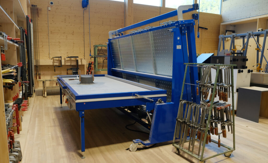 „Es ist immer wieder beeindruckend, wie gleichmäßig und kraftvoll der Druck verteilt wird“, sagt Grohe. Dass der Unterdruck auch bei der Abbundzeit hilft, ist ein zusätzlicher Pluspunkt. Das gilt für große Projekte ebenso wie für kleine. So überzeugt die Presse auch bei der präzisen Fertigung eines kreisrunden Rahmens aus etlichen Furnierlagen. Und wenn sie einmal nicht gebraucht wird, lässt sie sich leichtgängig und schnell hochklappen, zur Seite rollen und schafft so Platz – etwa für Korpusteile, die auf die Auslieferung warten.