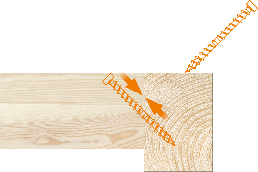 Das vordere Gewinde zieht sich schnell ins Holz, das hintere zieht die Bauteile zusammen. So kommen Haupt- und Nebenträger gleichmäßig zusammen – kraftschlüssig an der Scherfuge und mit gleichmäßigem Druck. Spaltfreie und formstabile Verbindungen entstehen, die Bewegungen im Holz ausgleichen, z.B. Quellen oder Schwinden. Der Zylinderkopf ermöglicht es dabei, die Schraube auch bei geringen Randabständen bündig zu versenken. Die Verbindung bleibt nahezu unsichtbar. Gleichzeitig erfüllt sie Ansprüche an den Brandschutz.