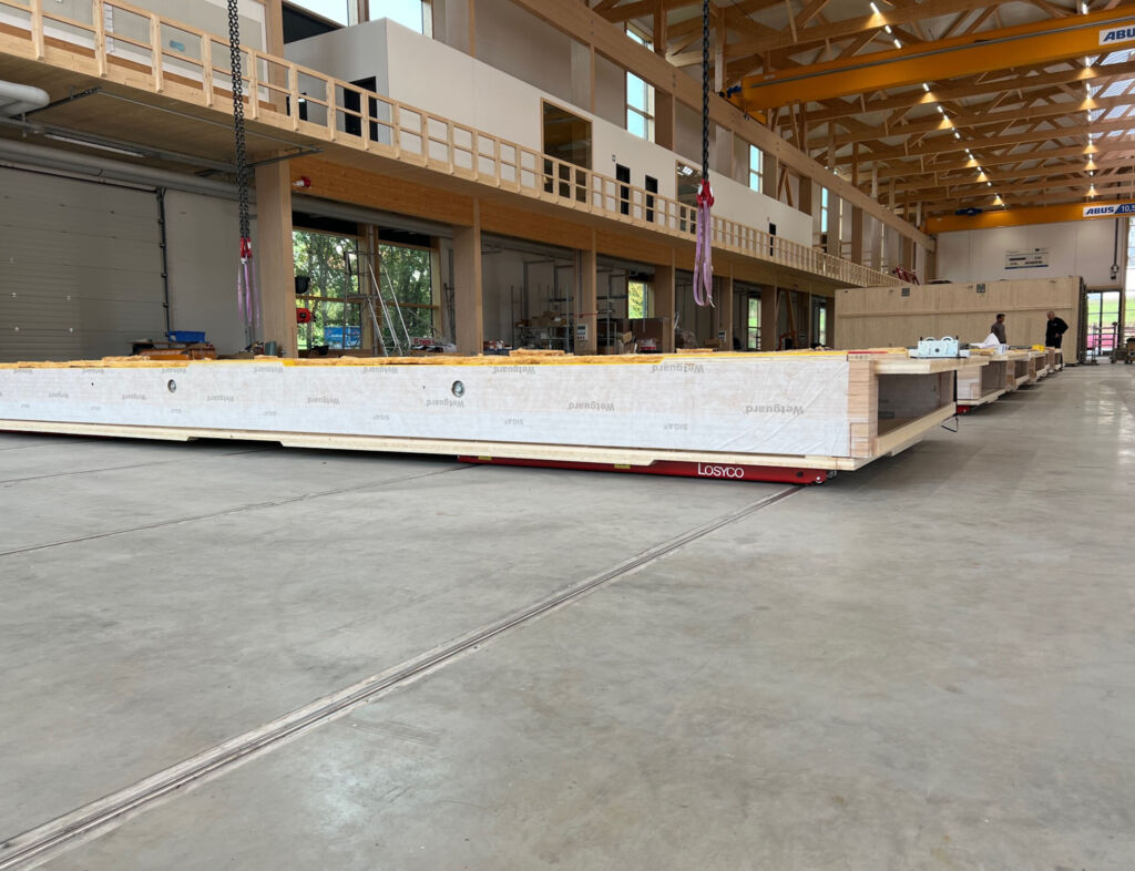 In die Erweiterung seiner Produktionsstätten hat der Holzbauer über 4Mio.€ investiert. Das Projekt war nach kurzer Bauzeit abgeschlossen, sodass die 97m lange, 48m breite und 16m hohe Halle bereits vergangenen Oktober in Betrieb genommen werden konnte. In ihrem Inneren sorgt eine von Losyco konstruierte Produktionslogistik für fließende Fertigungsabläufe: auf Basis des ursprünglich für den Maschinenbau entwickelten Loxrail-Systems. „Das Loxrail-System hat uns durch das Preis-Leistungs-Verhältnis und seine flexible Anwendung überzeugt“, erklärt Baumgarten-Projektleiter Holger Fröhlich. „Mit dem Fördersystem können wir Module unterschiedlichster Abmessungen in der Fließfertigung anwendungsfreundlich von einer Station zur nächsten bewegen.“