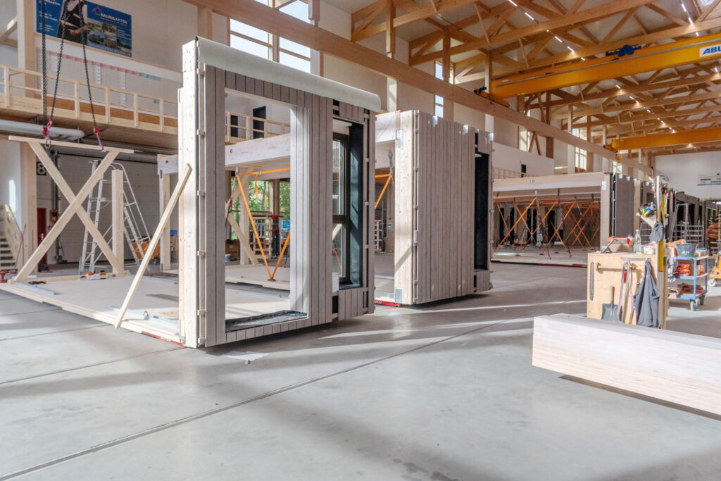 Angesichts der steigenden Nachfrage nach modular gefertigten Bauten entschloss sich Baumgarten 2022 zum Ausbau seiner Produktionskapazitäten. Vor rund 165 Jahren als Sägewerk gegründet, beschäftigt das hessische Unternehmen heute über 100 Mitarbeiter mit der Herstellung von Gebäudesegmenten aus Fichtenholz – von gewerblichen Zweckbauten über öffentliche Gebäude bis zum Eigenheim. Mit der neuen Werkhalle konnte Baumgarten seine 3D-Fertigung ausbauen. Auf 3.300m² werden jetzt aus Flächenteilen jährlich bis zu 600 vorgefertigte Raummodule hergestellt, die fast schlüsselfertig zur Baustelle gelangen.