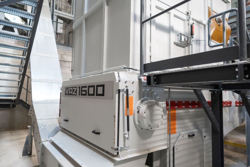 Wir installierten unseren Zerkleinerer der Baureihe VAZ 1600. Bei dieser Maschine haben wir verschiedene Ausstattungsmöglichkeiten, beispielsweise können wir Schwingungsdämpfer anbringen, die die Vibrationen auffangen, die beim Schreddern von CLT entstehen. Der Rotor ist mit Schneidkronen bestückt und in der Größe an das Endprodukt und die Sieblochung angepasst. Der Rotormantel kann bei Bedarf aufgepanzert werden. Das verringert den Verschleiß durch mechanischen Abrieb. Zum Einsatz kommt unser elektrischer Direktantrieb HiTorc. Verbaut ist zudem eine Rasterkupplung als Fremdkörperschutz. Dazu kommt ein Sieb mit einem kleinen Lochdurchmesser. Diese einstufige Zerkleinerung des VAZ erübrigt eine Vor- und Nachbearbeitung. Zugeführt werden die großformatigen Reststücke über ein Förderband oder einen Kran. Um die Maschine damit zu beschicken, haben wir einen Kipptrichter vorgeschaltet. Er hebt oder senkt sich je nach Füllgrad.
